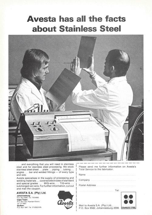 “A Mysterious Thing”When Albert Moore, the founder of the company which bears his name, set up shop at Bellville, Cape in 1945 to mould one-piece sinks, “Stainless steel was a mysterious thing and our manufacturing process required all kinds of weird treatments”. For more than 30 years Albert Moore (both company and man) have remained wedded to stainless steel, and have specialised in the fabrication of stainless steel products to the exclusion of all other materials. 30 years ago the major problems facing Albert Moore were the lack of physical technology and training in South Africa, and the lack of skilled personnel. As new techniques, particularly in welding and cutting were perfected, so the company put them to good use. When skilled personnel were needed, these were found from those markets more experienced in stainless steel fabrication (notably in Europe). (Mr. C.S. “Bert” Fiander, now Technical Director of the Almaks – Airtec Stainless Steel Division (Abercom Group), and current Chairman of the Heavy Fabricators Association was one specialist brought to South Africa under contract to Albert Moore as long ago as 1948). Today, the material is no longer “A mysterious thing”, and the company has progressed to the fabrication of equipment far more sophisticated than the domestic sink. But the company remains essentially the vehicle of Albert Moore himself: pioneer, innovator and specialist in stainless steel. From the Domestic Sink to the Uranium Plant.South Africa’s economy since 1945 has been one of rapid growth, and during the past 30 years, secondary industry generally has developed to replace previously imported goods and satisfy local market requirements, first with simple consumer goods but increasingly with the more complex requirements of the industrial and scientific sectors. And such is the size of the South African economy, and so geographically spread, that many fabricators have grown with a portfolio of products spread across several market demand sectors, because the economies of scale in production do not allow specialisation in any one product field. Albert Moore’s growth in South Africa reflects this general experience, but with a major constancy: all horizontal development has been into new market demand areas in which stainless steel is the material of fabrication. And despite a breadth of product range, Albert Moore has become a well known name and specialist with experience in different markets with different products.