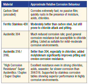 Corrosion tables (Alleima, Outokumpu) show that carbon steel corrodes quickly in nearly all aqueous acidic and chloride environments. Stainless steel grade 304 is acceptable in many mildly corrosive environments but becomes susceptible in chlorides. The molybdenum containing grade 316 shows significantly better performance due to the molybdenum and is recommended for seawater, chlorides, and industrial chemicals.