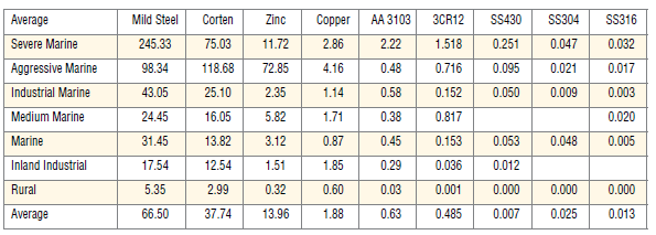 The table shows the result of corrosion tests done on various materials under various corrosive conditions. The bottom row shows the average over the range of conditions. For example, under severe marine conditions, grade 316 will suffer a material loss of 0.032% per year whilst 3CR12 will an
