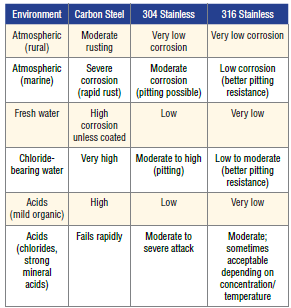 If carbon steel is compared to different stainless steel grades in different environments the following qualitative ranges are commonly accepted in corrosion engineering and reflected in stainless steel selection tables.